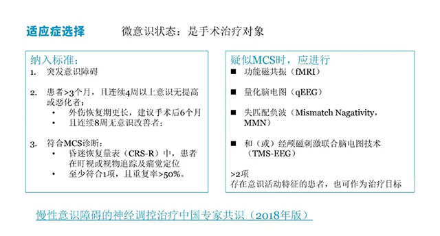脊髓神經(jīng)電刺激手術(shù)的患者評估過程至關(guān)重要,Chris 表示:“60%患者篩選,30%參數(shù)程控,10%手術(shù)”。根據(jù)《慢性意識障礙的神經(jīng)調(diào)控治療中國專家共識》,開展SCS促醒治療應建立由CRS-R量表、多模態(tài)腦成像技術(shù)、及神經(jīng)電生理技術(shù)聯(lián)合的綜合評估體系,以減少由于患者意識波動、運動功能障礙、以及臨床評定者經(jīng)驗不足所導致的臨床誤診。