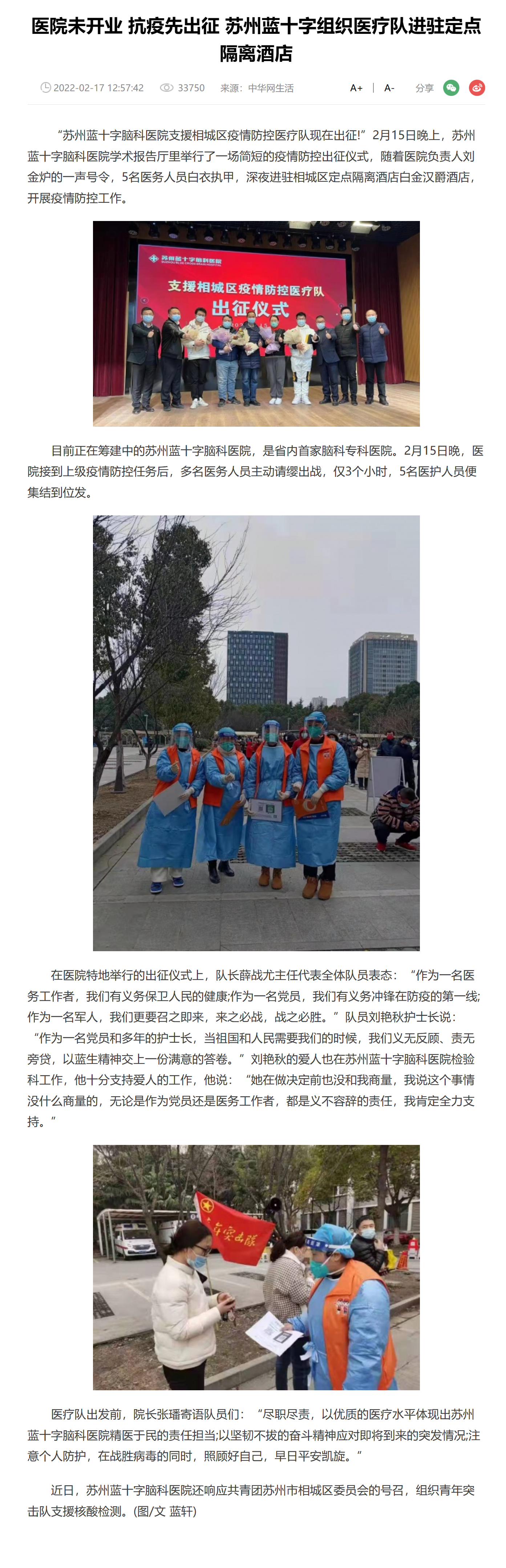 “蘇州藍(lán)十字腦科醫(yī)院支援相城區(qū)疫情防控醫(yī)療隊(duì)現(xiàn)在出征!”2月15日晚上,蘇州藍(lán)十字腦科醫(yī)院學(xué)術(shù)報(bào)告廳里舉行了一場(chǎng)簡短的疫情防控出征儀式,隨著醫(yī)院負(fù)責(zé)人劉金爐的一聲號(hào)令,5名醫(yī)務(wù)人員白衣執(zhí)甲,深夜進(jìn)駐相城區(qū)定點(diǎn)隔離酒店白金漢爵酒店,開展疫情防控工作。